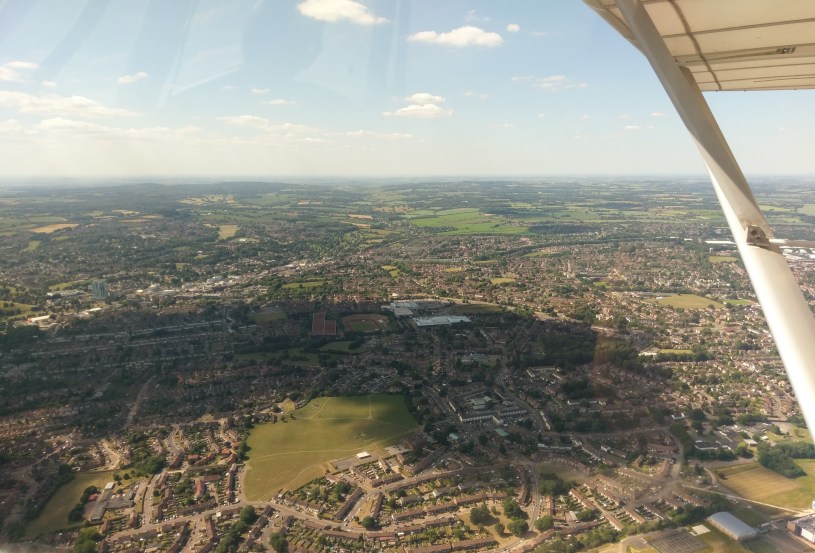 Flying around the southern perimeter of Luton’s airspace later, I was uncomfortably aware of the difference between open fields and built-up towns. I kept looking for where we’d be able to come down in a hurry, even though James was keeping us at 2000 feet. It was also a lot bumpier over the town and in the midday heat now, so this bit was more experience and endurance than pleasure. Dan was ahead of us and we kept in contact on the radio, but there was a scary moment when we were both in the circuit, but we couldn’t see him ahead. There’s a funny dogleg you need to take to avoid the village, swing past the pylons, over the trees, and up a dip on final – was I ever pleased it wasn’t me flying! I had plotted the route, checked out the runways, radio frequencies and got PPR. I’d studied the area on satellite images, but none of that seemed to help when it came to the real thing.